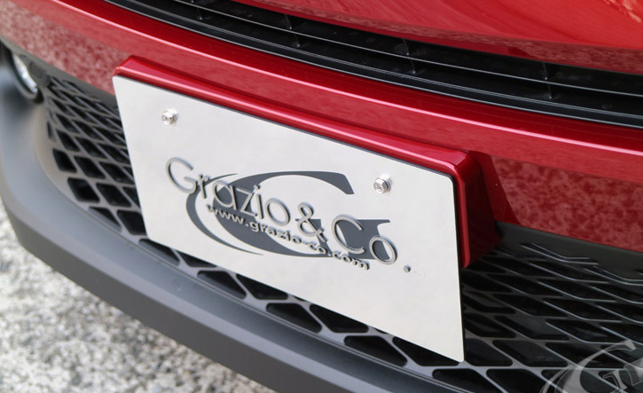 グラージオのエクステリアコーディネイト。標準ではボディカラーを問わず黒い樹脂の素地が剥き出しとなっているナンバーベースをボディ色により一体感を演出するC-HR前期用フロントナンバーベース。