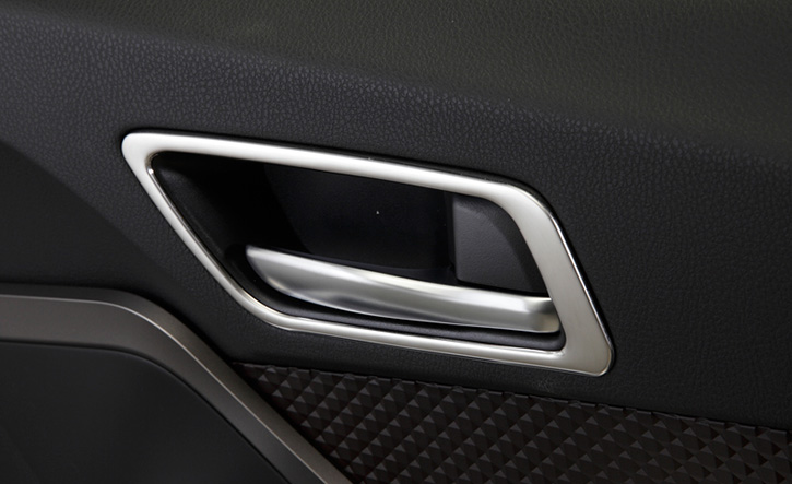 REVIER(レヴィーア)C-HR用ドアハンドルベゼル。ドアノブ周りに鏡面仕上げのアクセントによって、インテリアに高級感を与えるドアノブリング。