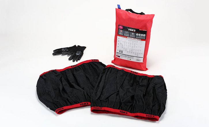 タイヤが雪に接すると瞬間的に雪が溶けて水膜が発生します。この水分がスリップの原因となります。トムス×イッセ・スノーソックスの表面は強靭な繊維を束ねた撚(よ)り糸が立体的に編み込まれ、従来の布製チェーンに比べて非常に厚みのある作りになっています。
