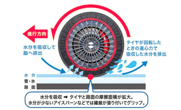 これが水分をしっかりと吸収し、タイヤと路面の摩擦面積を広げてグリップ力を高めます。水分の多い日本の雪道や、シャーベット状になりやすい都心の路面でも安心して走行できるのはこのためです。