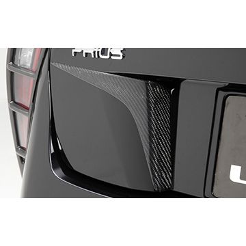 バックドアのリアライセンス両サイドの立ち上がり部分へ貼り付けることでテールゲートにスポーティ感を与える50系プリウス用カーボンバックドアガーニッシュ。