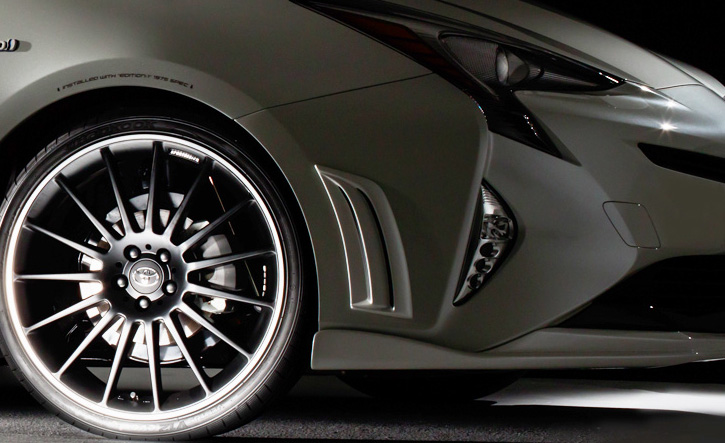 グラージオのエクステリアコーディネイト。フロントバンパー左右にダミーのエアーアウトレットを設けることでワンランク上のビジュアルにする50プリウス前期用サイドエフェクター。