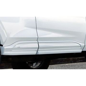 トヨタディーラー販売のエアロをプロデュースするLX-MODE(LXモード)、バックアップデザイン。サイドドア下部の黒シボ樹脂モールド部をボディ同色でカバーすることでワイド&ロースタイルを純正形状のまま演出する50RAV4用カラードサイドドアパネル。