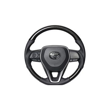 TOM'SがリリースするRAV4用ステアリング。スポーティーかつ操作性に優れたガングリップのパンチングレザーとリアルカーボンを使用し、本物のみが持つ高い質感を実現したカーボンコンビハンドル。