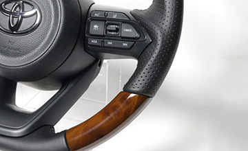 昔っからのドレスアップ、ステアリング交換。現在では純正エアバッグステアリングが主流のため、カスタム出来ないと思っている方多いかと思いますが、そんなことはありません。 ドレスアップ度が高いウッドとレザーの、純正エアバッグ対応ウッドコンビステアリングや ステアリングカバーが主流となっております。