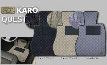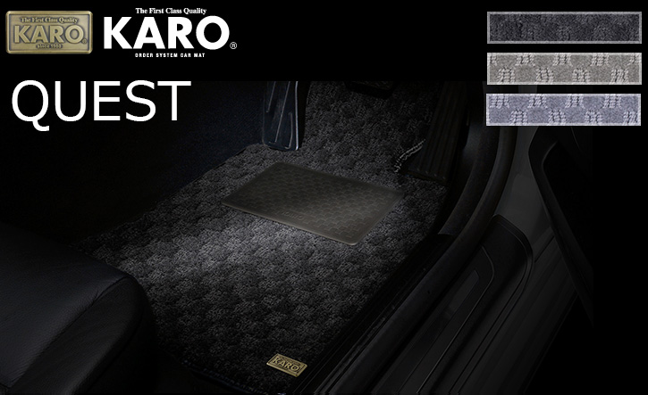 KAROが開発した特殊化学繊維にカット&ループ製法を施し、長い毛足と豊かなボリュームを実現した最高級品です。高密度で丹念に織り上げられたクエストは抜群の防音効果と断熱効果をもたらし、車内に静寂、快適な空間を提供し、圧倒的なボリュームを持って重厚な車格を演出します。さらにクエストはSG加工を施してありますので、汚れや油分をはじきます。クエストは原反製造の技術改良により、摩擦でおこる毛羽立ちや毛玉が従来品(KAROism)と比べて大幅に減少しました。また、裏加工のラバーフォームを増量しバッキング工程を改良したことでさらに防音効果が増しました。